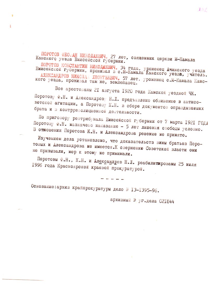 Поротовы Ф.Н., К.Н. и Александров Н.Л. реабилитированы 25 июля 1996 года
