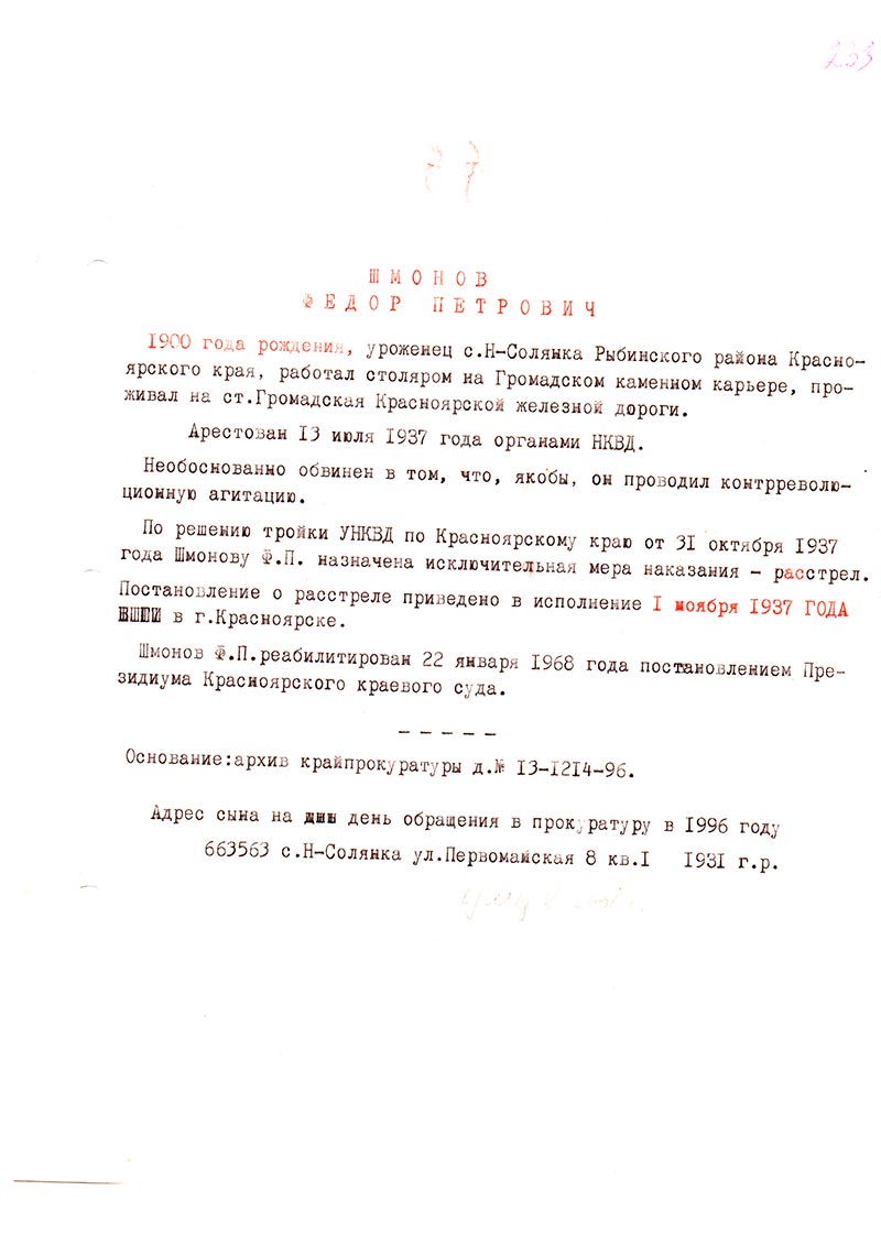 Шмонов Ф.П. реабилитирован 22 января 1968 года постановлением Президиума Красноярского краевого суда.