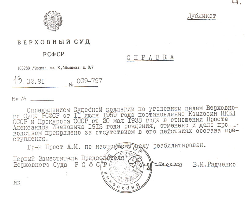 Определением судебной коллегии по уголовным делам Верховного Суда РСФСР от 11 июля 1959 года постановление Комиссии НКВД СССР и Прокурора СССР от 20 мая 1938 года в отношении Проста Александра Ивановича 1912 года рождения, отменено и дело производством прекращено за отсутствием в его действиях состава преступления.