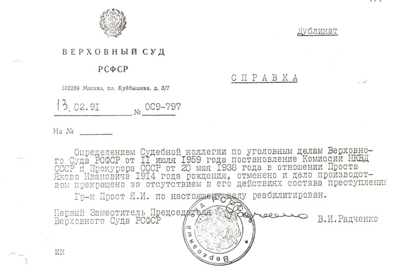 Определением судебной коллегии по уголовным делам Верховного Суда РСФСР от 11 июля 1959 года Прост Яков Иванович — реабилитирован.