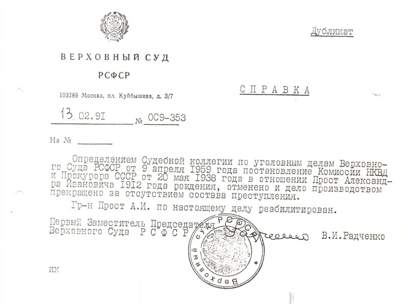 Определением судебной коллегии по уголовным делам Верховного Суда РСФСР от 9 апреля 1959 года Прост Александр Иванович — реабилитирован.