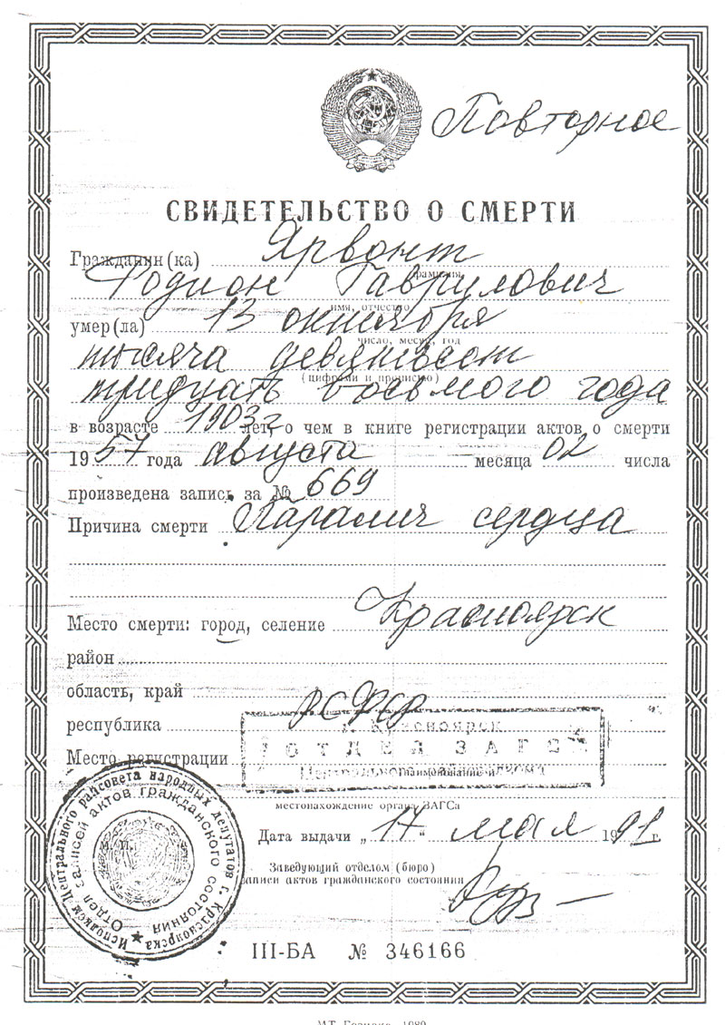 Место регистрации (штампом) Красноярск, 1? отдел ЗАГС Центрального райисполкома
