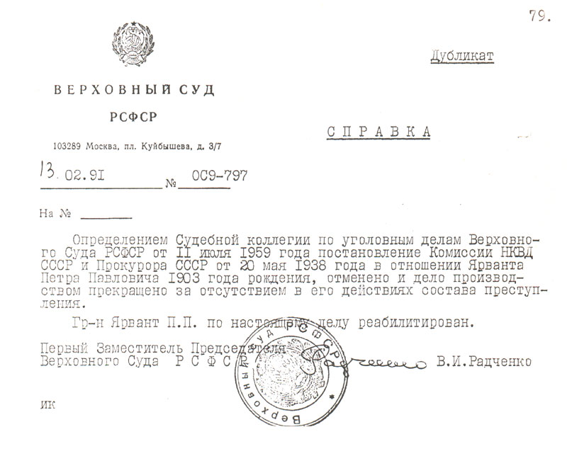 Определением судебной коллегии по уголовным делам Верховного суда РСФСР от 11 июля 1959 года Ярвант Петр Павлович реабилитирован.