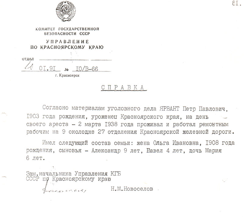 Основание: письмо управления КГБ СССР по Красноярскому краю от 10.01.1991 года за № 10/В-66.
