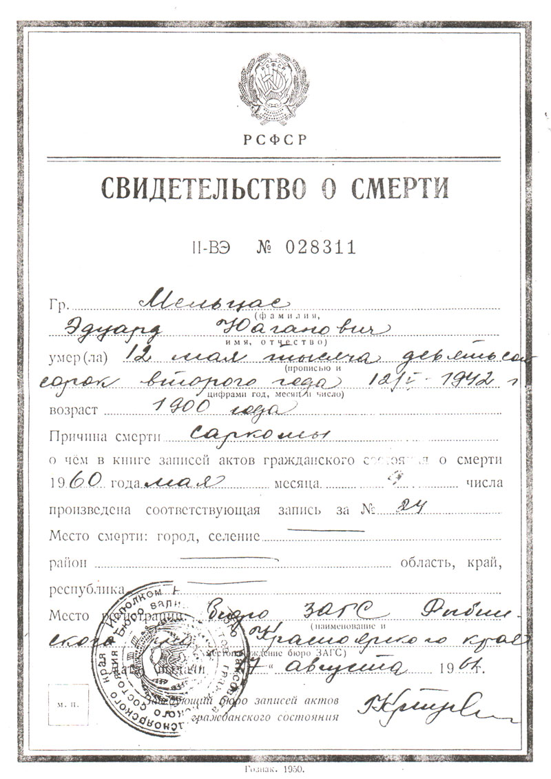 Гр. Мельцас Эдуард Юганович умер 12 мая, тысяча девятьсот сорок второго года