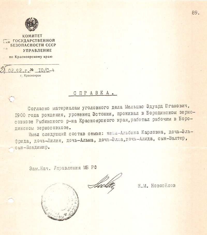 Выдана в том, что Постановление Комиссии НКВД и Прокурора СССР от 20 мая 1938 года в отношении Мельцас Эдуарда Югановича, 1900 года рождения, работавшего рабочим в Бородинском зерносовхозе, Рыбинского района Красноярского края, определением Судебной коллегии по уголовным делам Верховного суда РСФСР от 30 мая 1959 года отменено с прекращением дела производством за отсутствием в его действиях состава преступления.