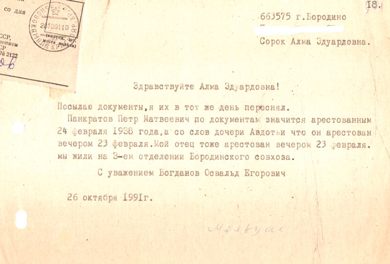 Как я Вам уже звонил и говорил, что архивы КГБ открыты и можно написать о судьбе отца. Сообщаю адрес: 660017 Красноярск-17 ул. Дзержинского 18, управление КГБ РСФСР по Красноярскому краю. В заявлении укажите от кого и свой адрес. Далее — мой отец ____, года рождения ____, проживал там-то, работал там-то, арестован тогда-то. Прошу сообщить в чем он обвинялся, его судьба, реабилитирован ли. Вышлите справку на получение пособия. Может в деле есть фото или документы, вышлите. Вот в таком духе напишите заявление. Как получите ответ, сообщите.