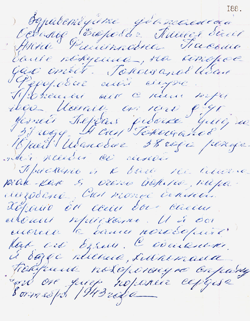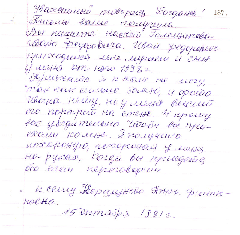Уважаемый товарищ Богданов! Письмо ваше получила. Вы пишете насчёт Голощапова