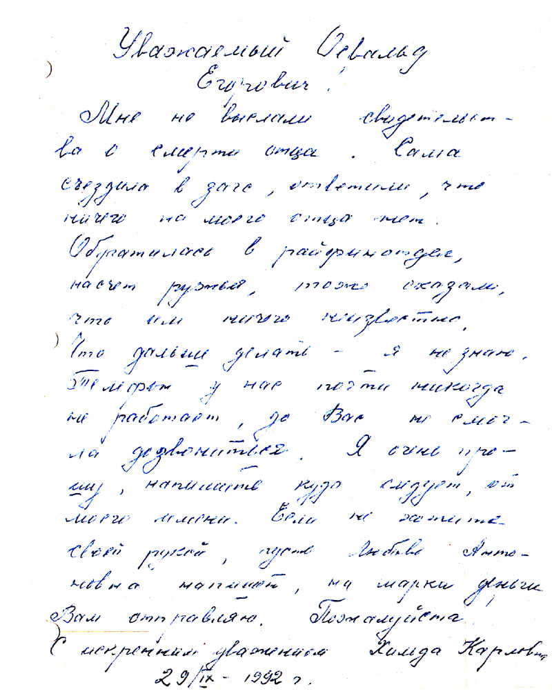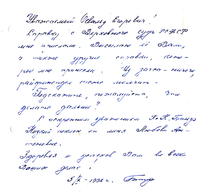 Справку с Верховного суда РСФСР мне прислали. Высылаю её Вам, а также другие