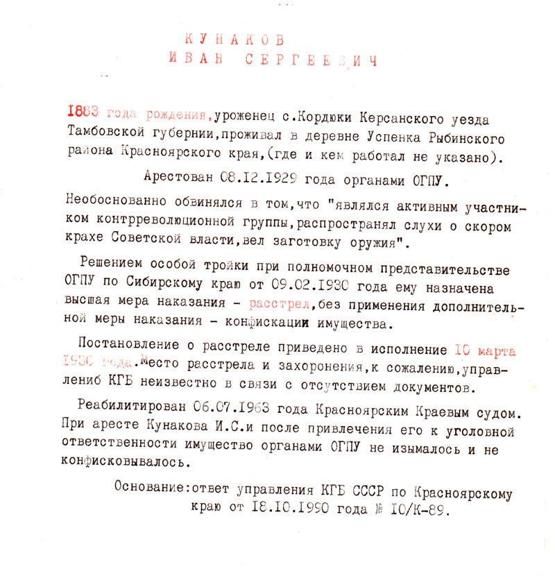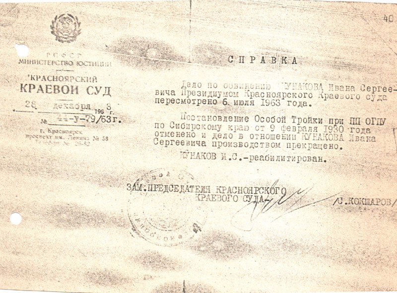 Реабилитирован 06.07.1963 года Красноярским Краевым судом. При аресте Кунакова И.С. и после привлечения его к уголовной ответственности имущество органами ОГПУ не изымалось и не конфисковывалось.