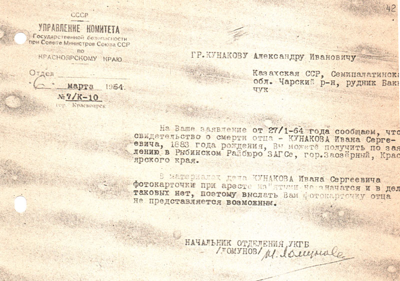 Управление КГБ СССР по Крас. краю). И с ответом они не задерживают.