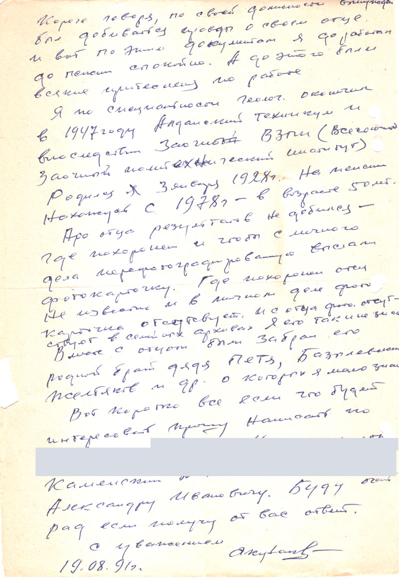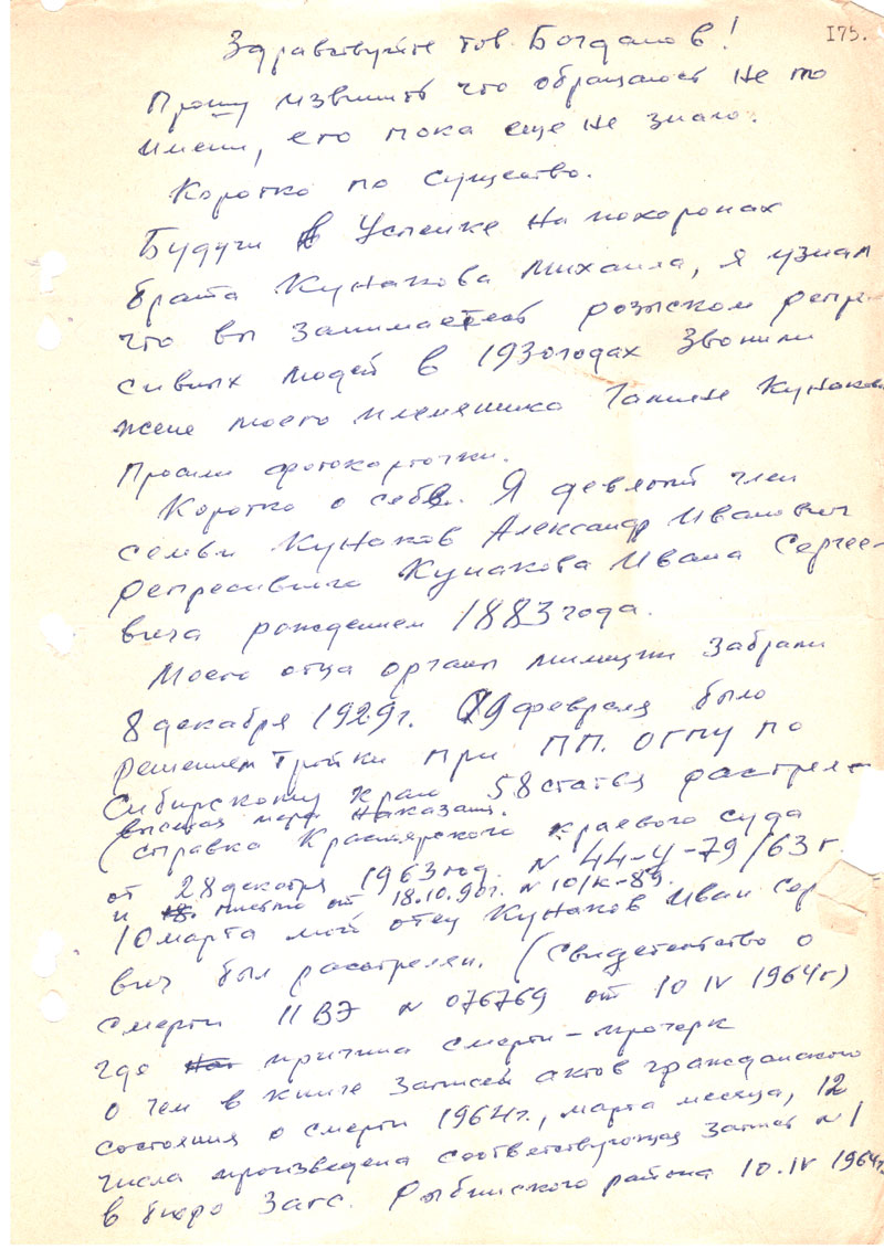 письмо от 18.10.90 г. № 10/К-89). 10 марта мой отец Кунаков Иван Сергеевич был