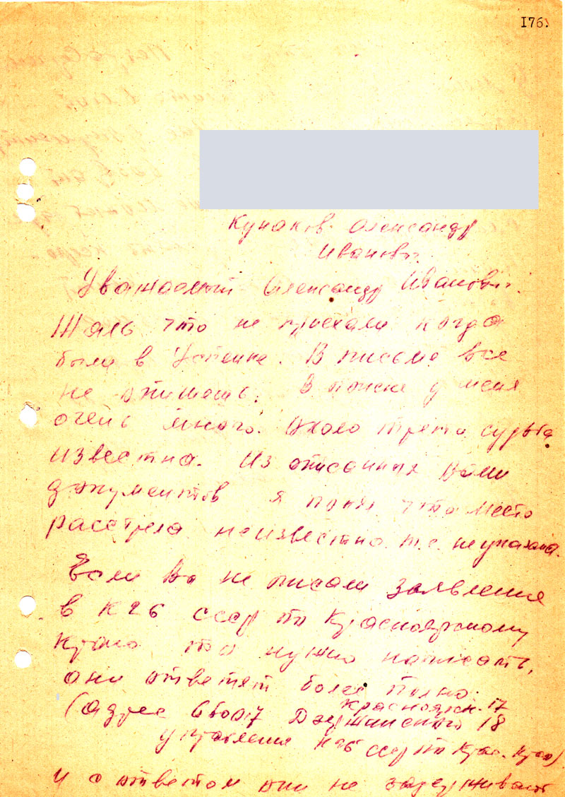 Копия: Кунакову Александру Ивановичу, прожив. Казахская ССР, Семипалатинская обл., Чарский р-н, рудник Бакырчик