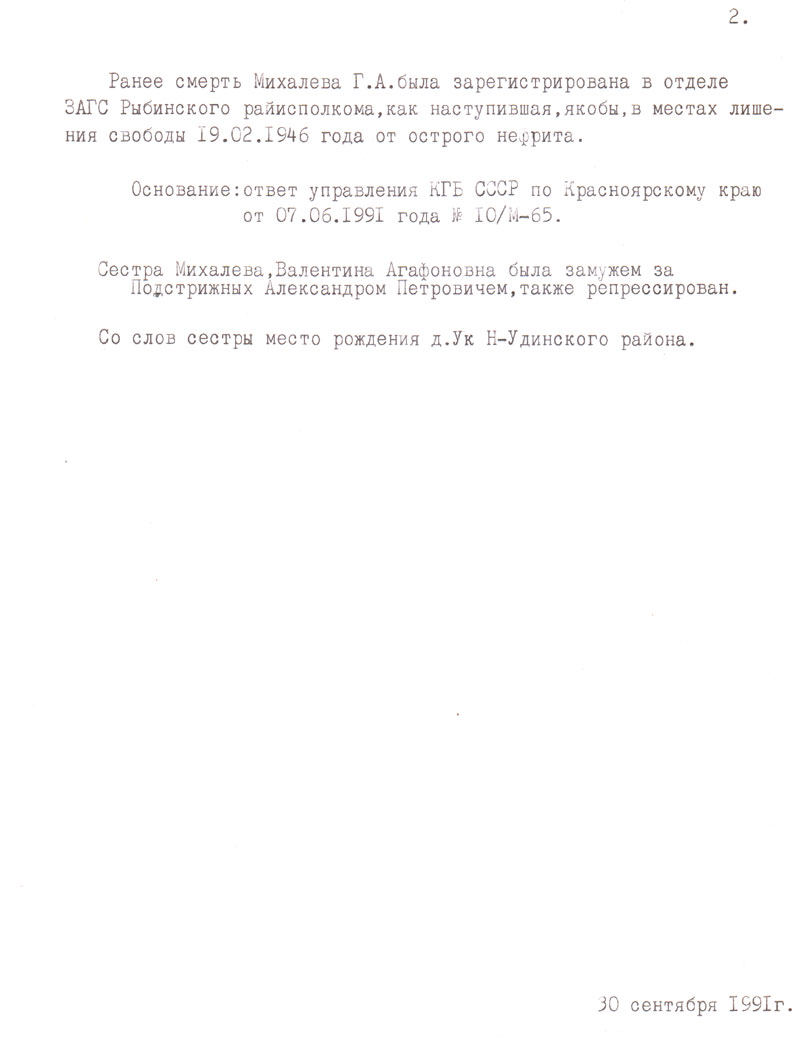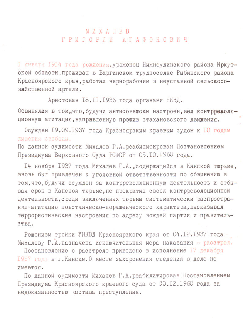 Решением тройки УНКВД Красноярского края от 04.12.1937 года Михалеву Г.А. назначена исключительная мера наказания — расстрел.