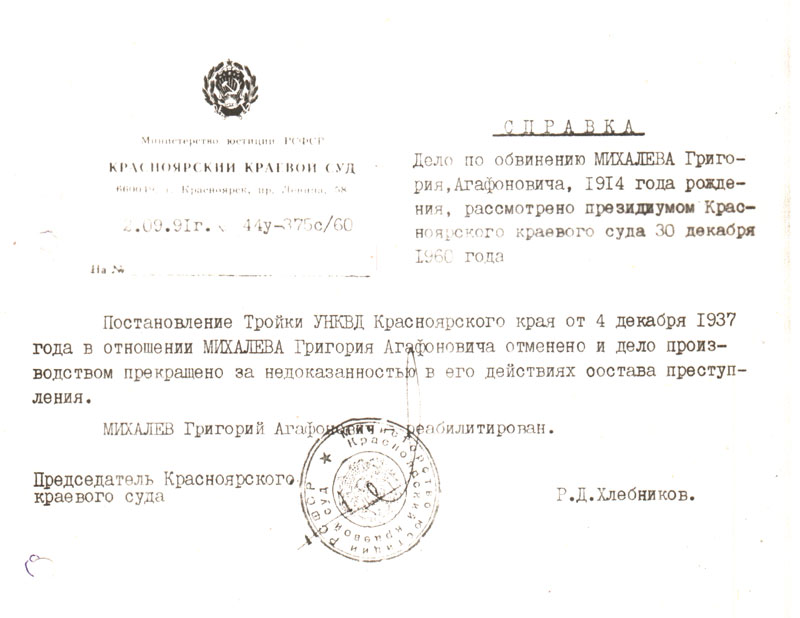 По данной судимости Михалев Г.А. реабилитирован Постановлением Президиума Красноярского краевого суда от 30.12.1960 года за недоказанностью состава преступления.