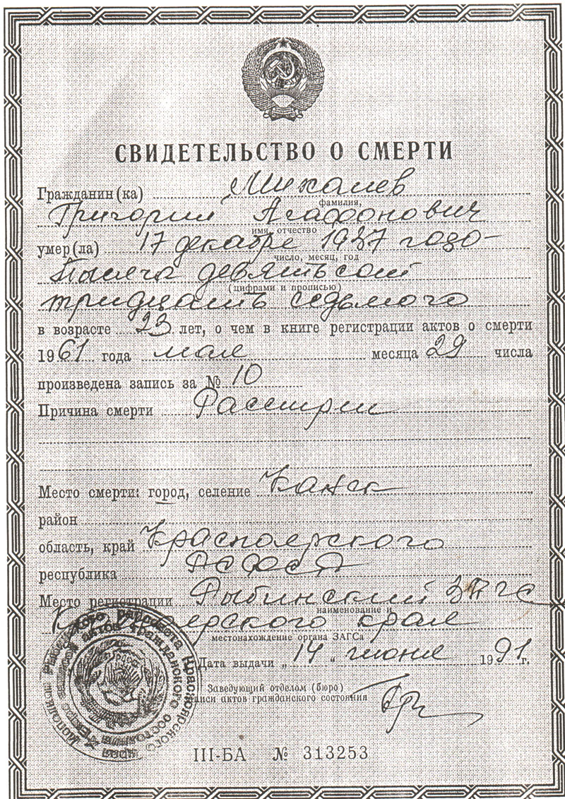 Гражданин Михалев Григорий Агафонович умер 17 декабря 1937 года тысяча