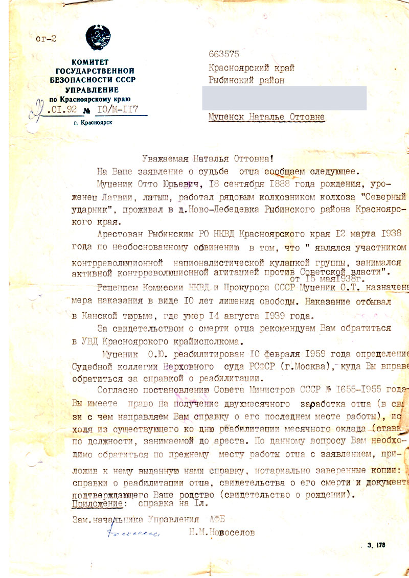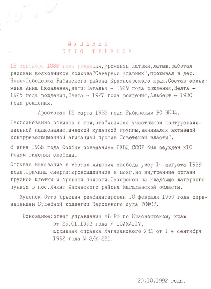 Муценек Отто Юрьевич реабилитирован 10 февраля 1959 года определением