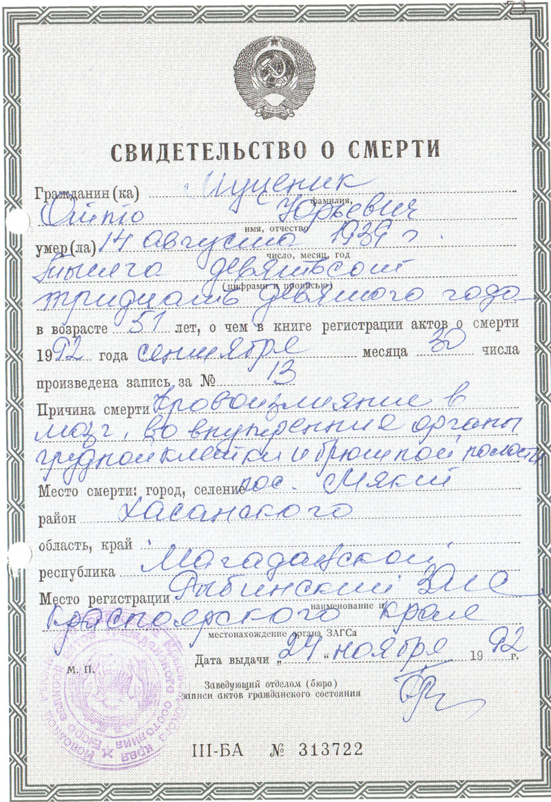 Гражданин Муценик* Отто Юрьевич умер 14 августа 1939 г. тысяча девятьсот тридцать девятого года в возрасте 51 лет, о чем в книге регистрации актов о смерти 1992 года сентября месяца 30 числа произведена запись за № 13
