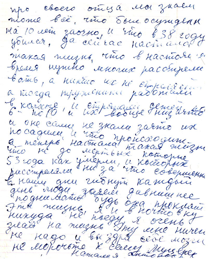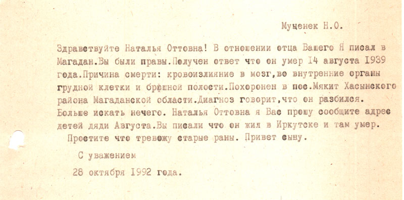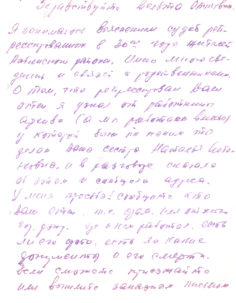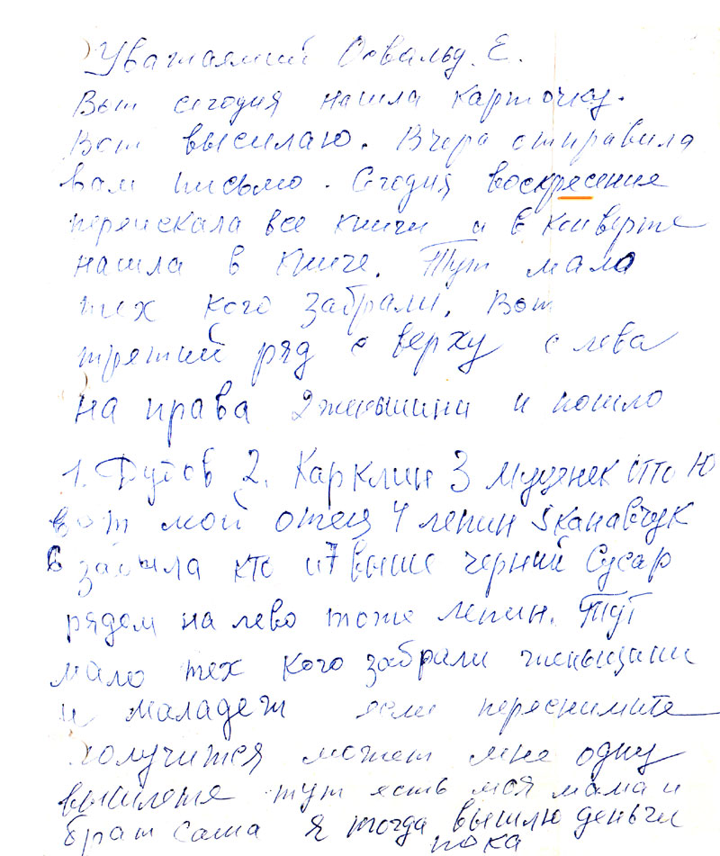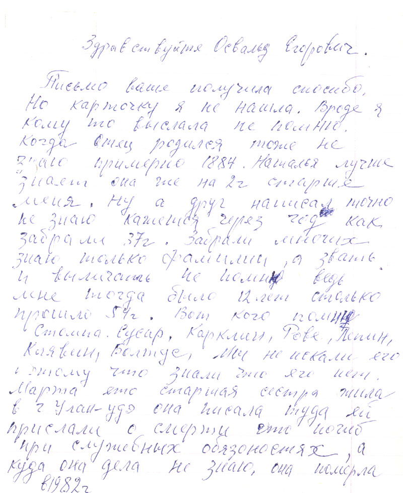 Письмо ваше получила спасибо. Но карточку я не нашла. Вроде я кому то выслала не помню. Когда отец родился тоже не знаю примерно 1884. Наталья лучше знает она же на 2 г. старше меня. Ну а друг написал точно не знаю кажется через год как забрали 37 г. Забрали многих знаю только фамилии, а звать и выличать не помню ведь мне тогда было 12 лет столько прошло 54 г. Вот кого помню Стомпа, Сусар, Карклин, Рове, Пепин, Клявин, Болтус. Мы не искали его потому что знали что его нет. Марта ето старшая сестра жила в г Улан-удэ, она писала туда ей прислали о смерти что погиб при служебных обязоностях, а куда она дела не знаю, она померла в 1982 г.