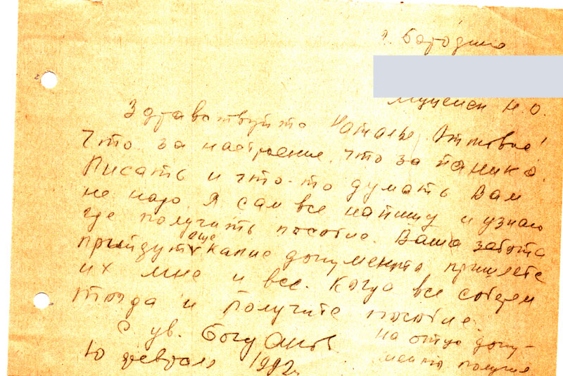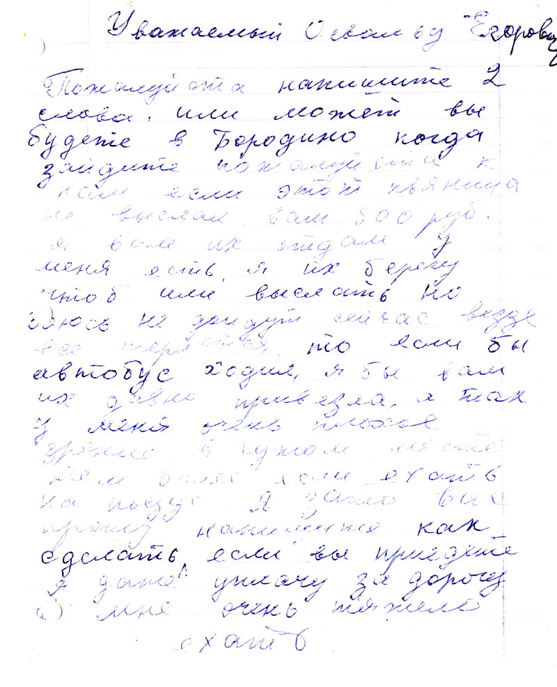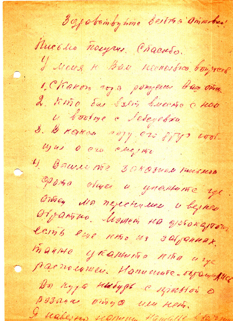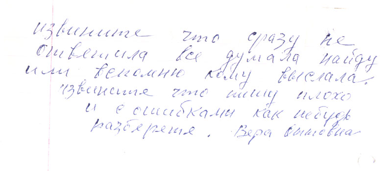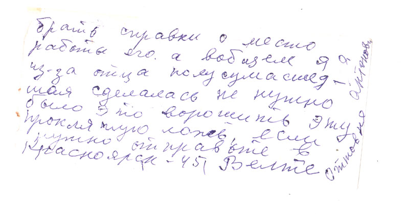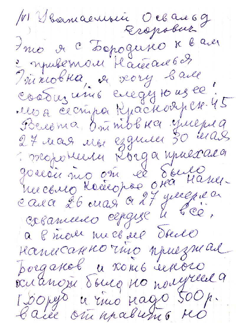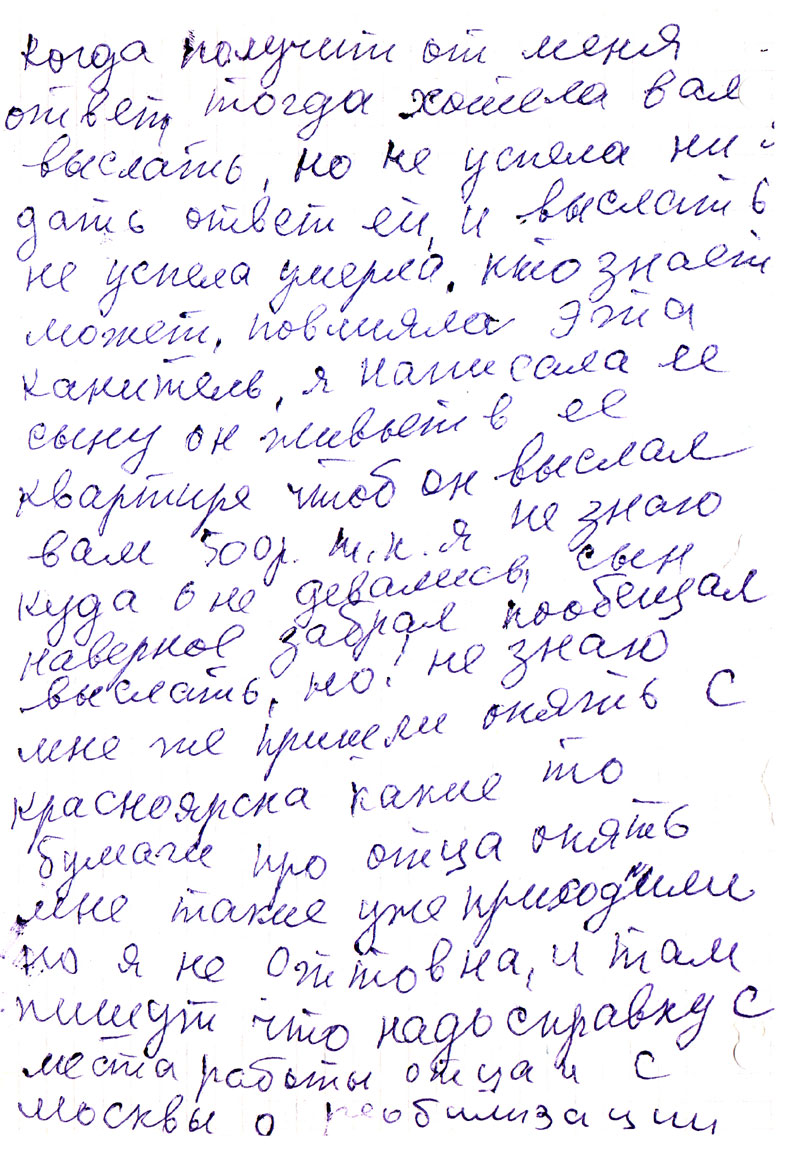 А что письме было написано что приезжал Богданов и хоть много хлопот было, но получила 1500 руб, и что надо 500 р вам отправить но когда получит от меня ответ тогда хотела вам выслать, но не успела ни дать ответ ей и выслать не успела умерла. Кто знает может, повлияла эта канитель, я написала ее сыну он живет в ее квартире чтоб он выслал вам 500 р. т.к. я не знаю куда они девались, сын наверное забрал пообещал выслать, но! не знаю мне же пришли опять с Красноярска какие-то бумаги про отца опять мне такие уже приходили. Но я не Оттовна, и там пишут что надо справку с места работы отца и с Москвы о реабилитации.