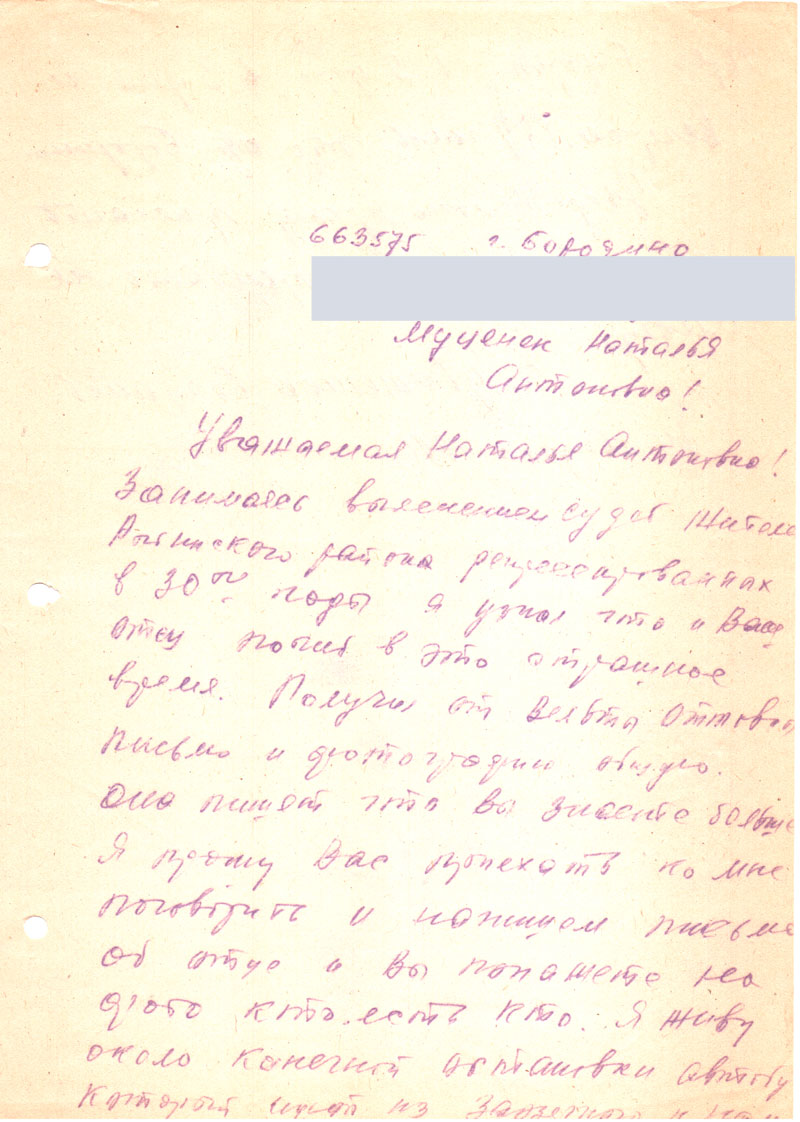 Я занимаюсь выяснением судеб репрессированных в 30-е годы жителей Рыбинского района. Имею много сведений и связей с родственниками. О том, что репрессирован Ваш отец я узнал от работницы архива (а мы работаем вместе) у которой была по каки-то делам Ваша сестра Наталья Антоновна, и в разговоре сказала об этом и сообщила адреса. У меня просьба: сообщите кто Ваш отец, т.е. фам. имя отчество, год рожд. где и кем работал. Есть ли его фото, есть ли какие документы о его смерти. Если сможете приезжайте или вышлите заказным письмом. Возврат гарантируется. У меня в списках есть фамилии Клявин, Рове, Стомпа (его мы разыскали), Мезит, ?Лепин <нрзб>, Бремза, ?Сеистуль <нрзб>, Авотин, ?Лейка, ?Винлис <нрзб>и др. Может Вы еще знаете кого из родственников из перечисленных выше переговорите если живут в почтовке и пусть напишут мне.