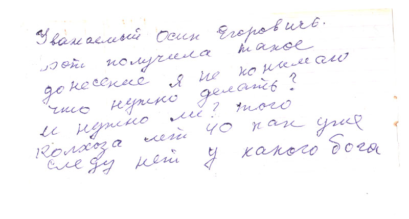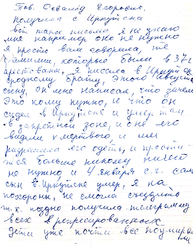 Тов. Освальд Егорович, получила с Иркутска вот такое письмо я не знаю мне например оно не нужно. Я просто вам говорила, те <нрзб>, которые были в 37 г. арестованы, я писала в Иркутск сродному брату, этого Августа сыну, он мне написал, что зачем это кому нужно, и что он сидел в Иркутске и умер там в запретной зоне, и они его видели мертвого, и им разрешили его одеть, и простится, больше никому ничего не нужно, и 4 января с.г. сам сын в Иркутске умер, я на похороны не смогла съездить т.к. поздно получила телеграмму. Всех репрессированных дети уже почти все поумирали.