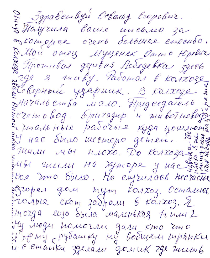 Получила ваше письмо за которое очень большое спасибо. Мой отец Муценек Отто Юрьевич проживал деревня Лебедевка здесь где я живу. Работал в колхозе Северный ударник. В колхозе начальства мало. Председатель счетовод бригадир и животновод остальные рабочие куда пошлют. У нас было шестеро детей. Жили мы плохо. До колхоза мы жили на хуторе у нас кое-что было. Но случилось несчастье. Сгорел дом тут колхоз. Остались голые, скот забрали в колхоз. Я тогда еще была маленькая 1 г. или 2. Ну люди помогли дали кто что кофту рубашку ну общем тряпки и с стайки сделали домик где жить.