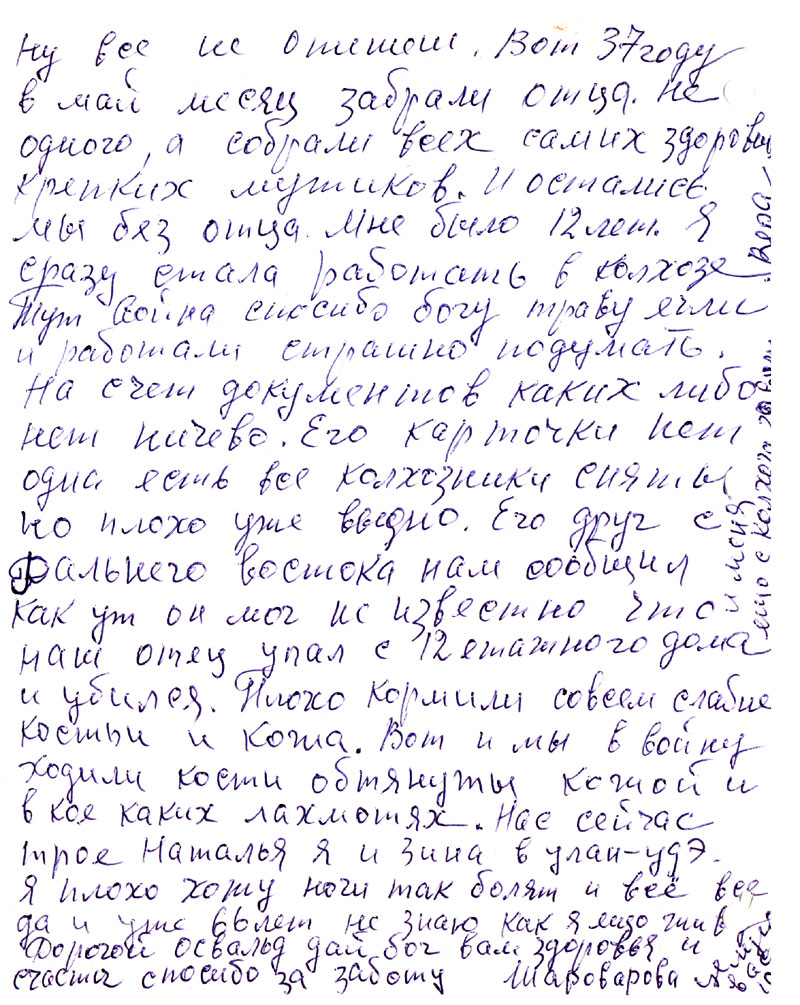 Ну все не опишешь. Вот 37 году в май месяц забрали отца. Не одного, а собрали всех самых здоровых крепких мужиков. И остались мы без отца. Мне было 12 лет. Я сразу стала работать в колхозе. Тут война спасибо богу траву ели и работали, страшно подумать. На счет документов каких либо нет ничего. Его карточки нет. Одна есть все колхозники сняты но плохо уже видно. Его друг с Дальнего Востока нам сообщил, как уж он мог не известно, что наш отец упал с 12 этажного дома и убился. Плохо кормили совсем, слабые кости и кожа. Вот и мы в войну ходили кости обтянуты кожей и в кое каких лохмотьях. Нас сейчас трое Наталья, я и Зина в Улан-Удэ. Я плохо хожу ноги так болят и все всегда и уже 66 лет не знаю как я еще жива.