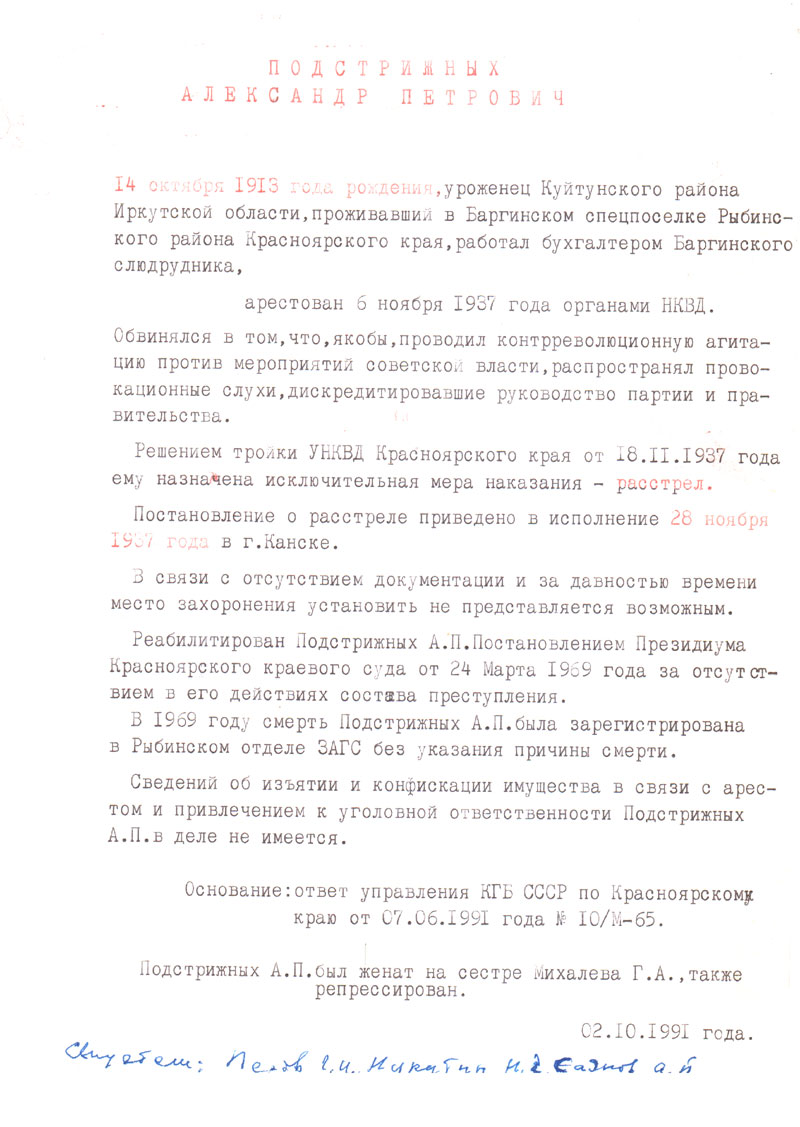 Реабилитирован Подстрижных А.П. Постановлением Президиума Красноярского краевого суда от 24 марта 1969 года за отсутствием в его действиях состава преступления.