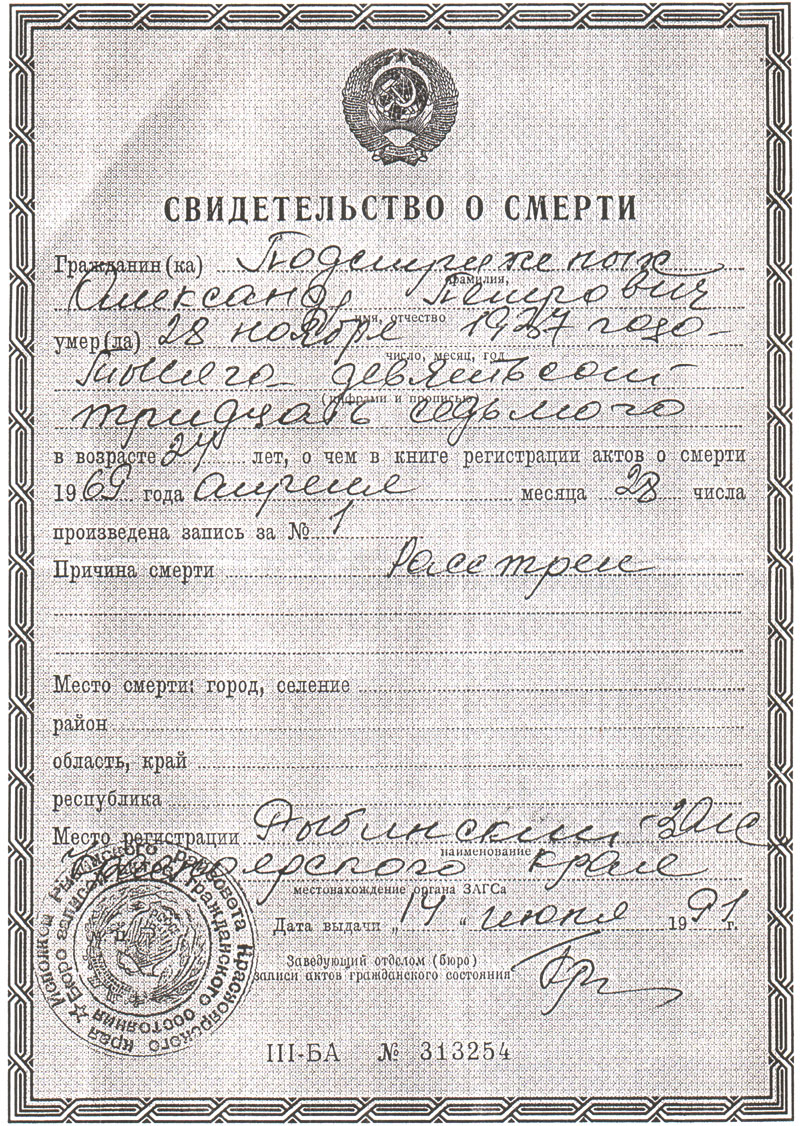 В 1969 году смерть Подстрижных А.П.была зарегистрирована