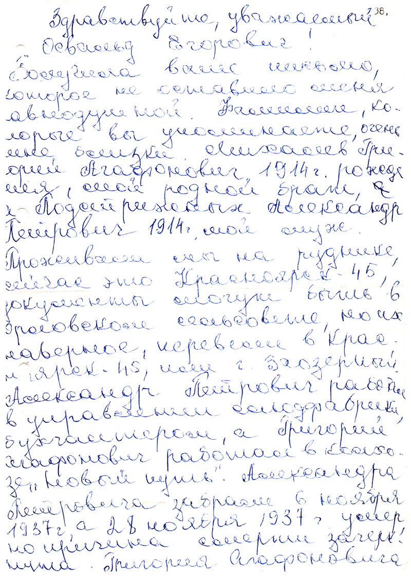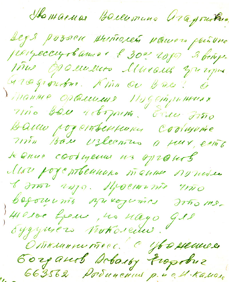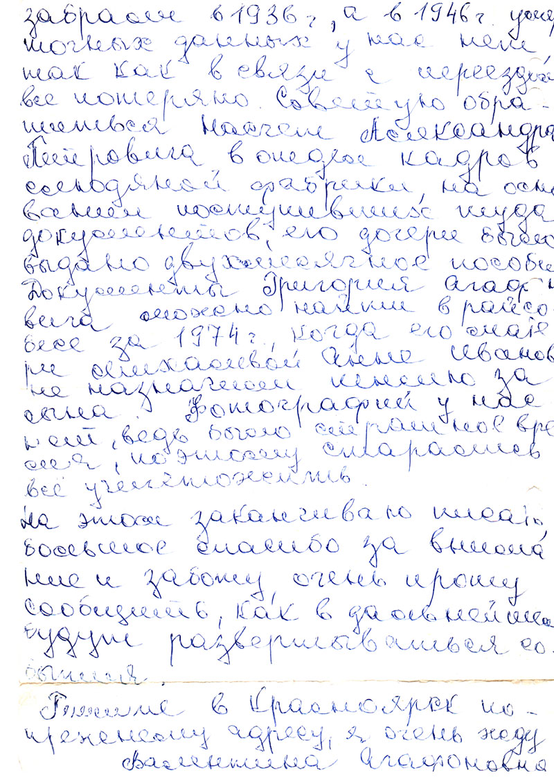 Проживали мы на руднике, сейчас это Красноярск-45, документы могут быть в орловском сельсовете, но их наверное, перевели в Красноярск-45, или г. Заозерный. Александр Петрович работа в управлении слюдфабрики, бухгалтером, а Григорий Агафонович работал в колхозе “Новый путь”. Александра Петровича забрали 6 ноября 1937 г., а 28 ноября 1937 г. умер, но причина смерти зачеркнута. Григория Агафоновича забрали в 1936 г., а в 1946 г. умер. Точных данных у нас нет, так как в связи с переездом все потеряно. Советую обратиться насчет Александра Петровича в отдел кадров слюдяной фабрики, на основании поступивших туда документов, его дочери было выдано двухмесячное пособие. Документы Григория Агафоновича можно найти в райсобесе за 1974 г., когда его матери Михалевой Анне Ивановне назначили пенсию за сына. Фотографий у нас нет, ведь было страшное время, поэтому старались все уничтожить.