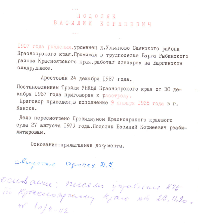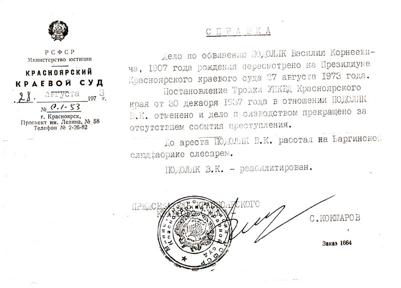 Дело пересмотрено Президиумом Красноярского краевого суда 27 августа 1973 года. Подоляк Василий Корнеевич реабилитирован.