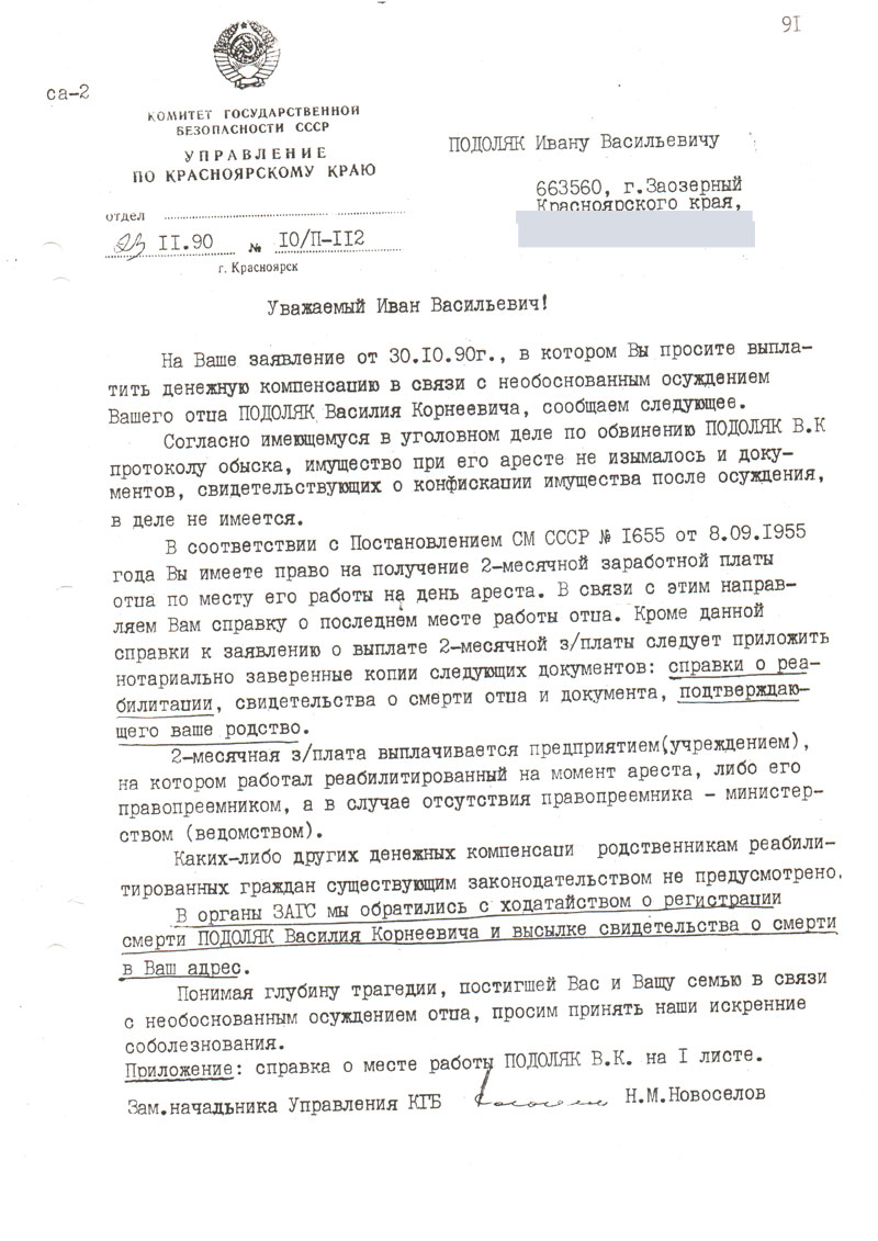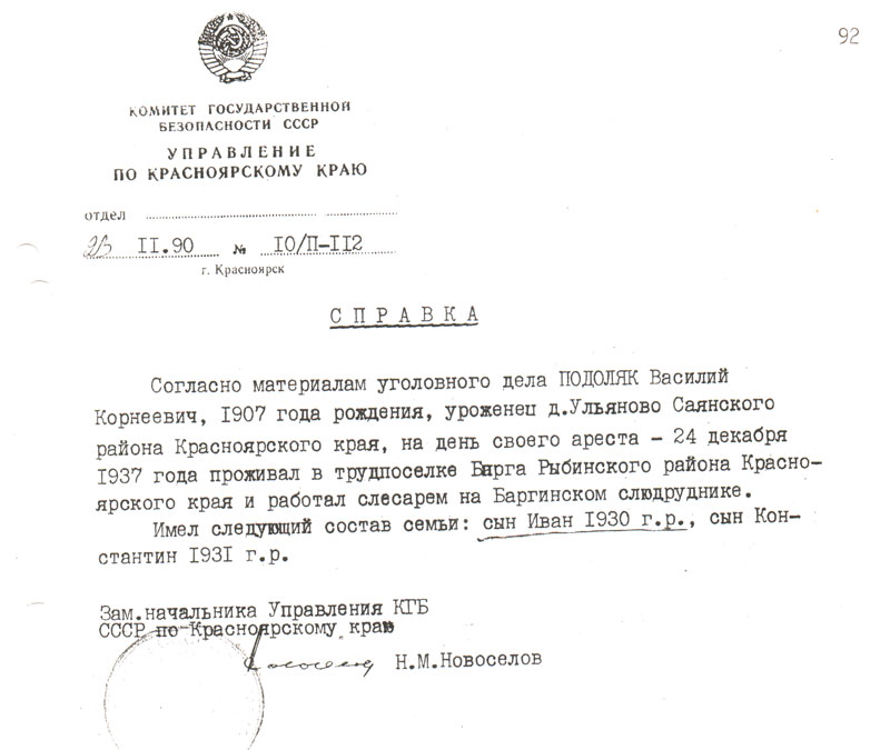 Основание: письмо управления КГБ по Красноярскому краю от 23.11.90 г. № 10/П-112