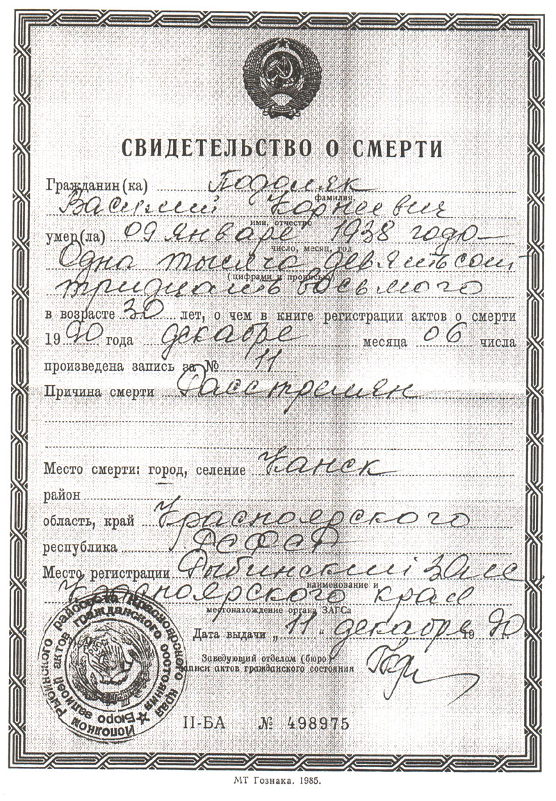 В органы ЗАГС мы обратились с ходатайством о регистрации смерти ПОДОЛЯК Василия Корнеевича и высылке свидетельства о смерти в Ваш адрес.