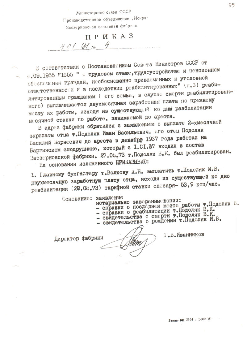 Заозерновской фабрики. 27.08.73 т. Подоляк В.К. был реабилитирован.