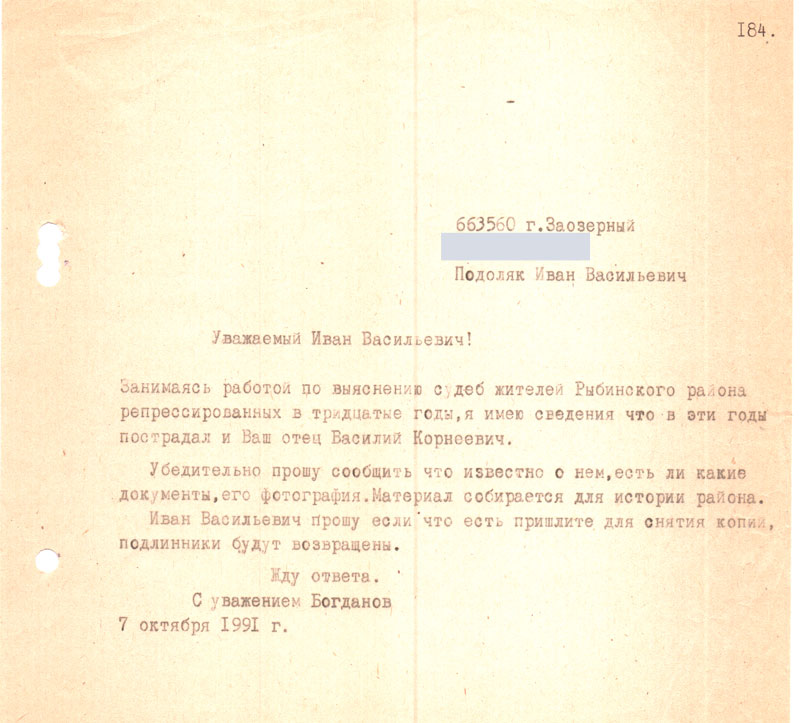 Занимаясь работой по выяснению судеб жителей Рыбинского района репрессированных