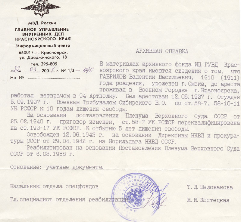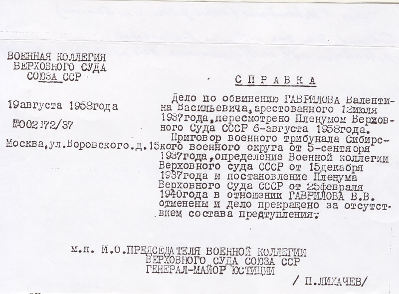 Гаврилов Валентин Васильевич. Документы