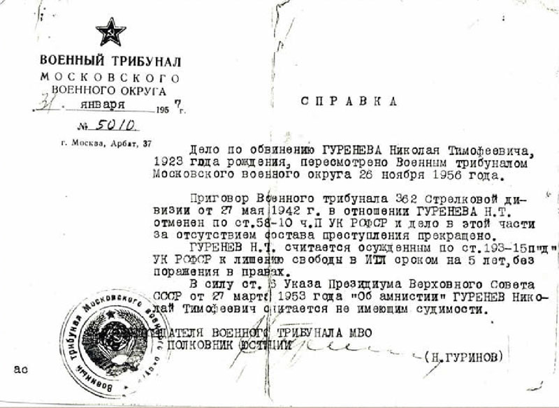 Гуренев Николай Тимофеевичю. Документы