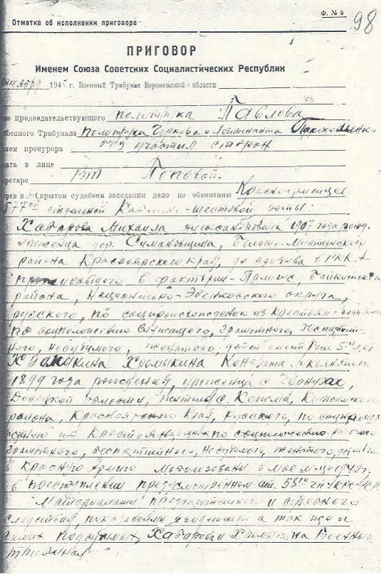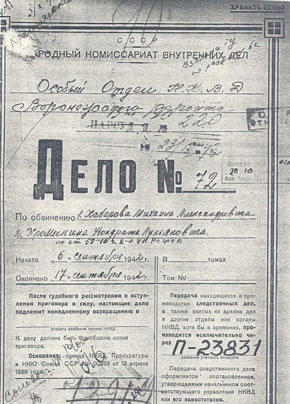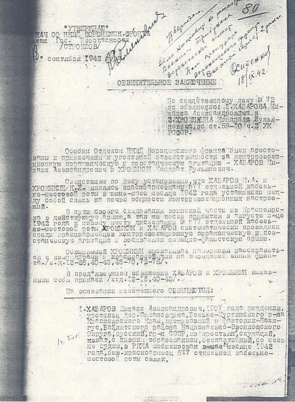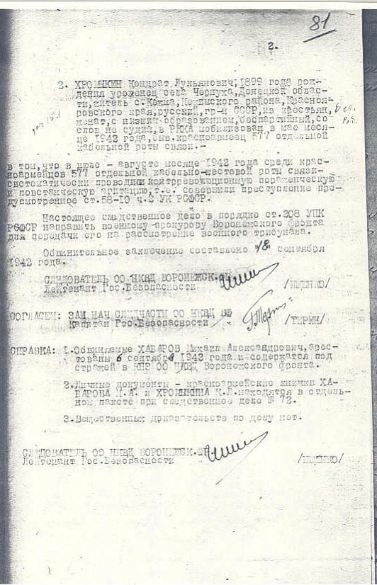 Особым отделом НКВД Воронежского фронта были арестованы и привлечены к уголовной ответственности за контрреволюционную, пораженческую и повстанческую агитацию - Хабаров Михаил Александрович и г. Хромыкин Кондрат Лукьянович.