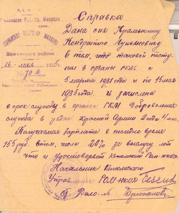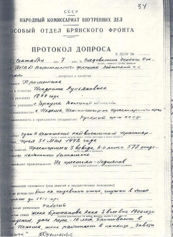 2. г. Хромыкин Кондрат Лукьянович, 1899 года рождения, уроженец села Чернуха, Донецкой области, житель села Кежма, Кежемского района, Красноярского края, русский, гр-н СССР, из крестьян, женат, с низшим образованием, беспартийный, со слов не судим, в РККА мобилизован в мае месяце 1942 года, быв. красноармеец 577 отдельной кабельно-шестовой роты связи