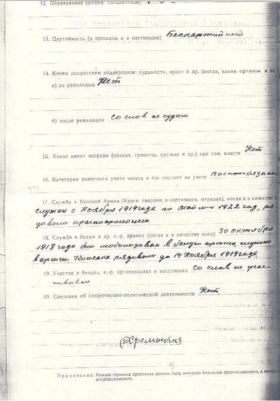 - Ответ: Я от следствия ничего не скрываю, контрреволюционной агитацией я никогда не занимался. Лично я за собой ничего не замечал. На фронт я ехал только защищать свою родину.