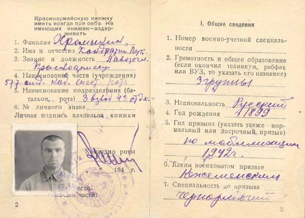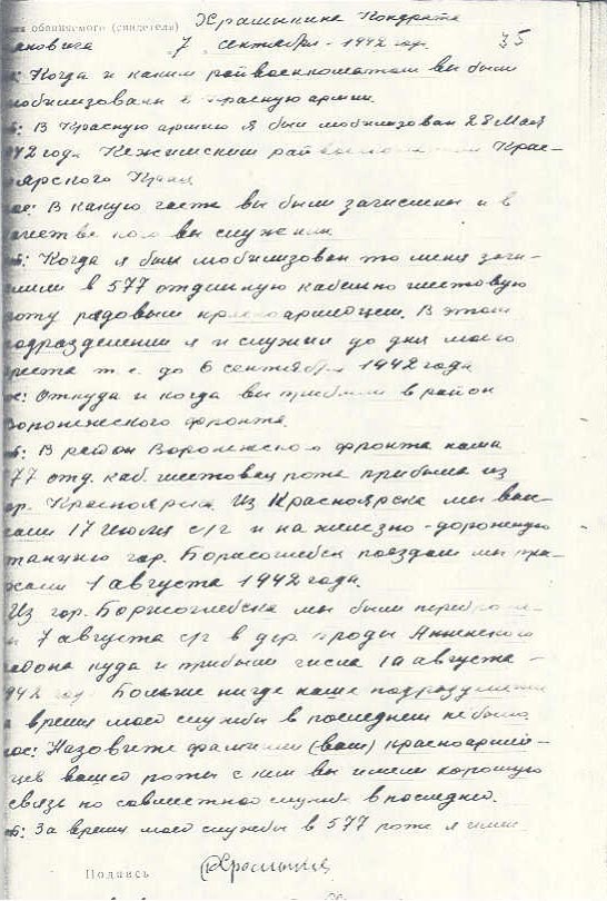 - Ответ: Когда я был мобилизован то меня зачислили в 577 отдельную кабельно-шестовую роту рядовым красноармейцем. В этом подразделении я и служил до дня моего ареста т.е. до 6 сентября 1942 года.