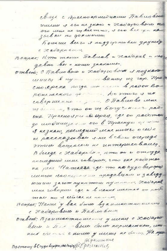- Ответ: С Павловым и Хабаровым я познакомился в пути следования из гор. Красноярска когда мы ехали в район Воронежского фронта. До этого я их совершенно не знал. О Павлове мне известно, что он из Богучанского района Красноярского края, где он работал до мобилизации его в Красную армию я не знаю, последний мне ничего о себе не рассказывал я в свою очередь этим вопросом не интересовался. В беседе с Хабаровым, кто он и откуда последний мне говорил, что он работал на реке Хатанга где-то на судоверфи линии кооперации продавцом и заведующим заготпунктом пушнины. Хабаров мне говорил где и в каких местах он работал но я сейчас не помню.