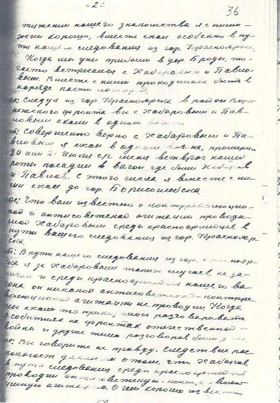 - Вопрос: Вы говорите не правду. Следствие располагает данными о том, что Хабаров в пути следования среди красноармейцев проводил антисоветскую-контрреволюционную агитацию. О чем хорошо известно и вам. Следствие настаивает рассказать об этом правду.