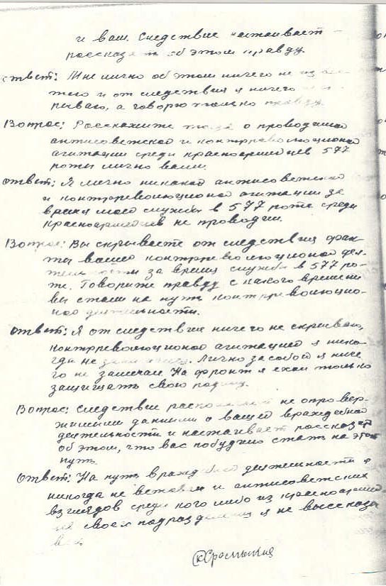 - Ответ: Я лично никакой антисоветской и контрреволюционной агитации за время моей службы в 577 роте среди красноармейцев не проводил.