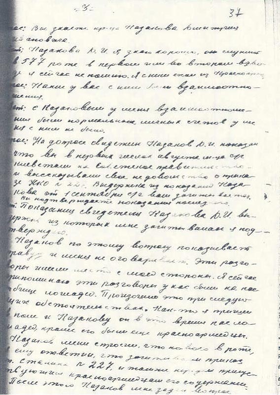 - Вопрос: На допросе свидетель Казаков Д.И. показал, что вы в первых числах августа месяца с.г. клеветали на Советское правительство и высказывали своё недовольство о приказе НКО №227. Выдержка из показаний Казакова от 1 сентября с.г. вам зачитывается. Вы подтверждаете показания последнего?