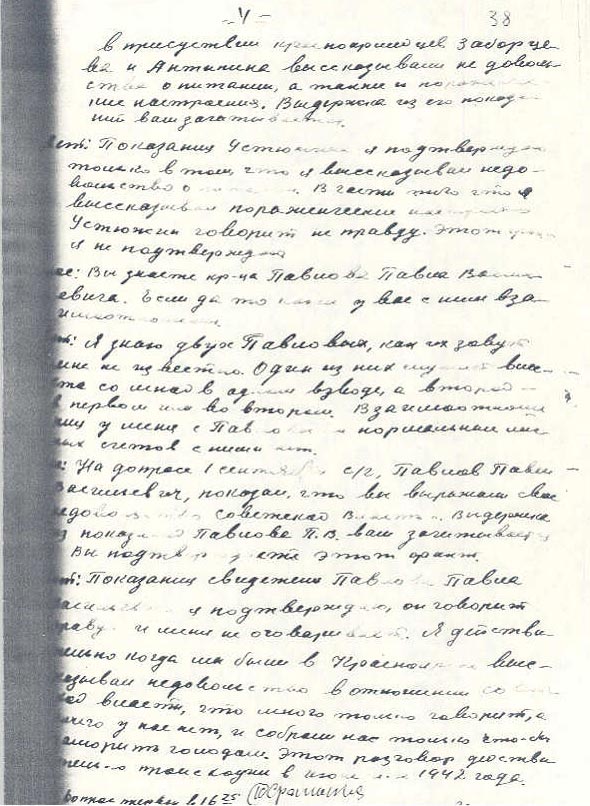 - Ответ: Показания свидетеля Павлова Павла Васильевича я подтверждаю, он говорит правду и меня не оговаривает. Я действительно когда мы были в Красноярске высказывал недовольство в отношении Советской власти, что много только говорит, а ничего у нас нет, и собрали нас только чтобы заморить голодом. Этот разговор действительно происходил в июне месяце 1942 года.