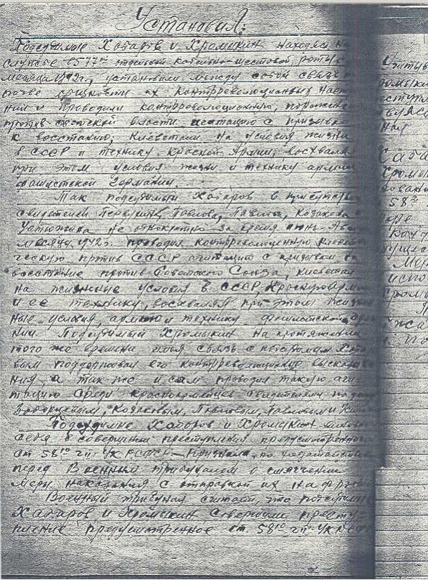 в том, что в июле – августе месяце 1942 года среди красноармейцев 577 отдельной кабельно-шестовой роты связи систематически проводили контрреволюционную пораженческую и повстанческую агитацию, т.е. совершили преступление предусмотренное ст.58-10 ч.2 УК РСФСР.