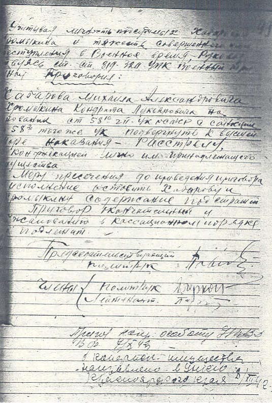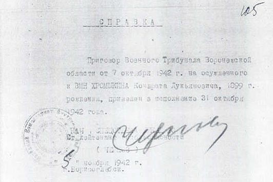 Приговор Военного Трибунала Воронежской области от 7 октября 1942 г. на осужденного к ВМН Хромыкина Кондрата Лукьяновича, 1899 г. рождения, приведен в исполнение 31 октября 1942 года.