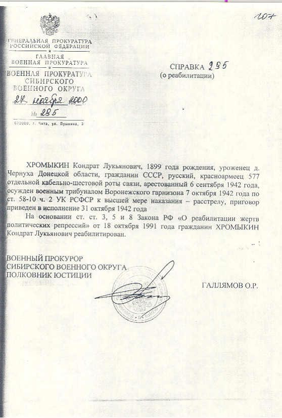- ХРОМЫКИН Кондрат Лукьянович, 1899 года рождения, уроженец с. Чернуха Донецкой области, русский, с начальным образованием, женатый, несудимый, в РККА с мая 1942 года, арестованный 6 сентября 1942 года